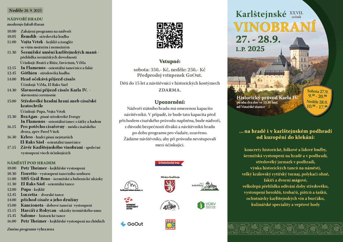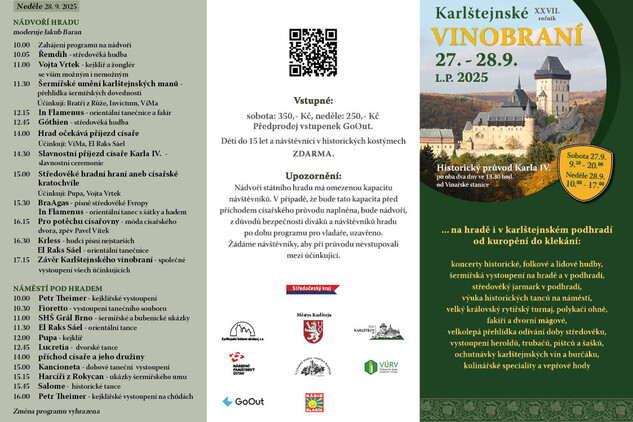 O víkendu 27. a 28. září 2025 se již po sedmadvacáté v podhradí Karlštejna i na hradním nádvoří na dva dny rozezvučí pištci, trubači a hudebníci, rozjedou se rytířská klání, roztančí se tanečnice a bude se slavit vinobraní. Ani letos si slavnost nenechá ujít sám císař Karel IV., který by letos oslavil své 709. narozeniny. Doprovázet jej bude jak jeho choť císařovna Eliška Pomořanská, tak více jak 150 dvořanů z Karlova dvora.